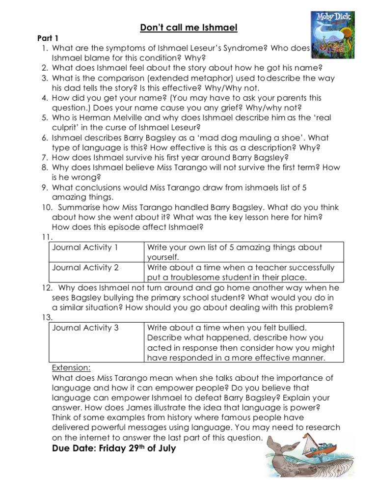 Jul 19, · The subject of. ‘the power of language’ is of import in the book ‘Don’t name me Ishmael’ by Michael Gerard Bauer. The book was interesting in many ways. power of linguistic communication is used non all the clip but in most of the instances. The chief obstruction of the subject ‘the power of language’ were the disfavor and Don’t Call Me Ishmael Essay – By Bob. Ishmael Leseur is the main character in “Don’t Call Me Ishmael”, a book by Michael Gerard Bauer. He courageously steps up to Year Nine only to be bullied for his name, embarrassed in front of his first love, and to become a complete social outcast. This leads to him naming Year Nine as “the toughest, the weirdest, the most Mar 24, · Don’t call me Ishmael Essay: Throughout Michael Gerard Bauer’s Don’t call me Ishmael, the author frequently displays the contrasts between the two characters Ishmael Leseur and James Scobie. The two characters help each other find themselves throughout the book. They teach many valuable lessons and prove to us that being yourself rules over all